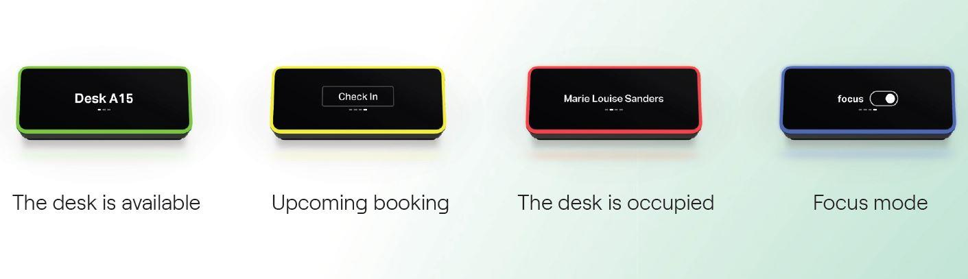 Bright and vivid colors indicates if a desk is available, checked-in, booked or signaling focus - please don’t disturb, this person wants to concentrate.