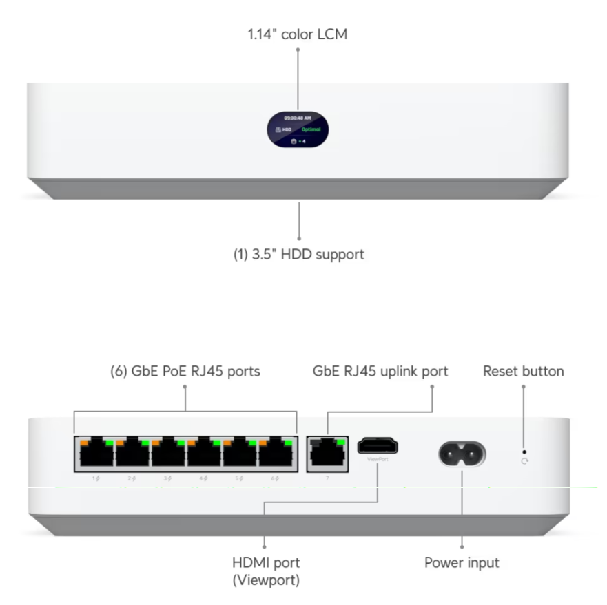 Compact UniFi Protect NVR with 3.5" HDD support, featuring an integrated 6-port PoE switch, integrated HDMI View Port, and a capacity for (6) 4K cameras or (15) Full HD cameras.